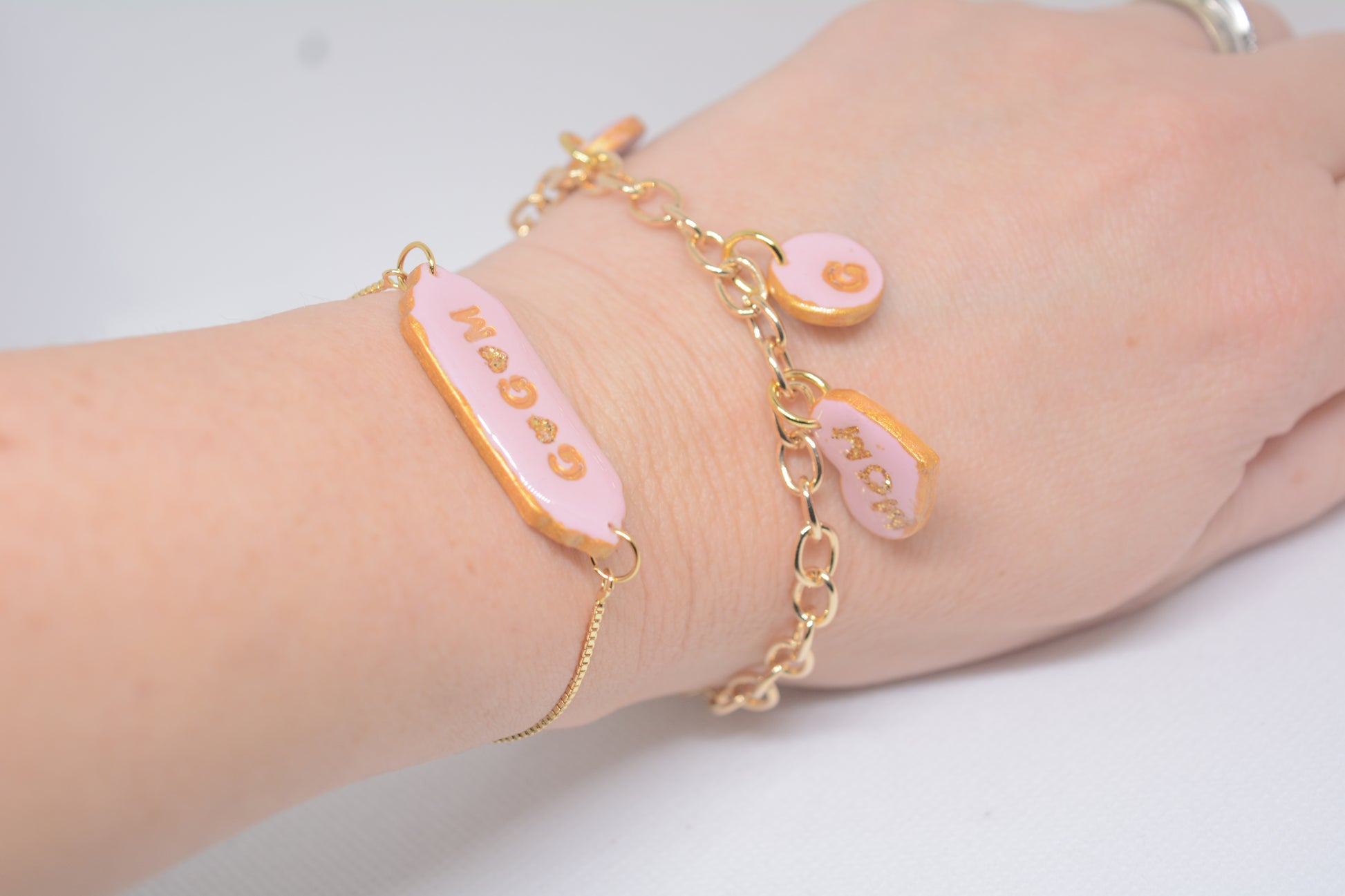 Bedels: Polymeerklei + laagje goudkleurige verf + laagje Resin.
